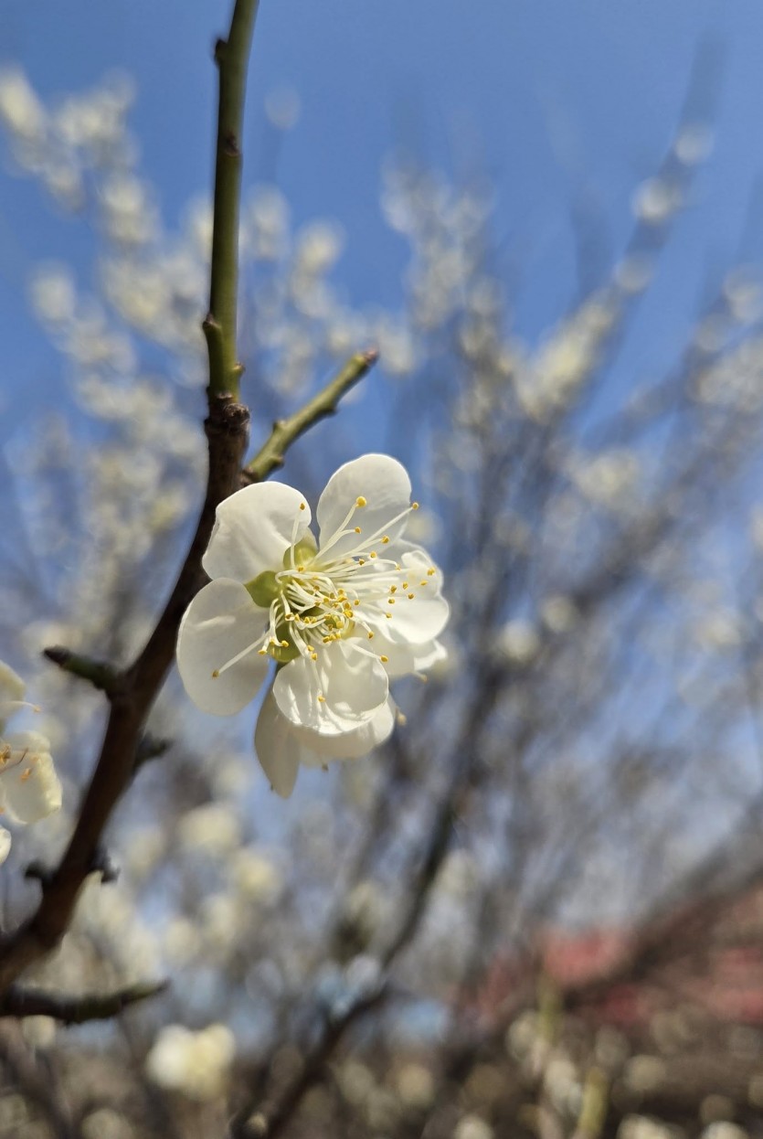 "여기 마당에 매화꽃이 참 이쁘게 피었어요"