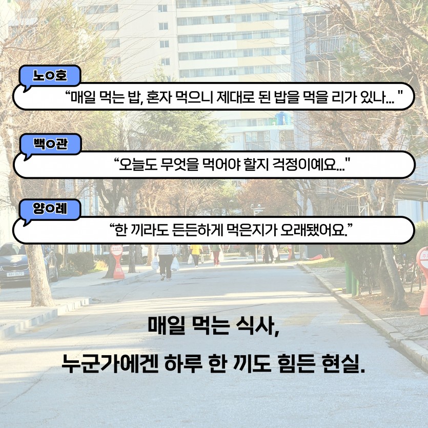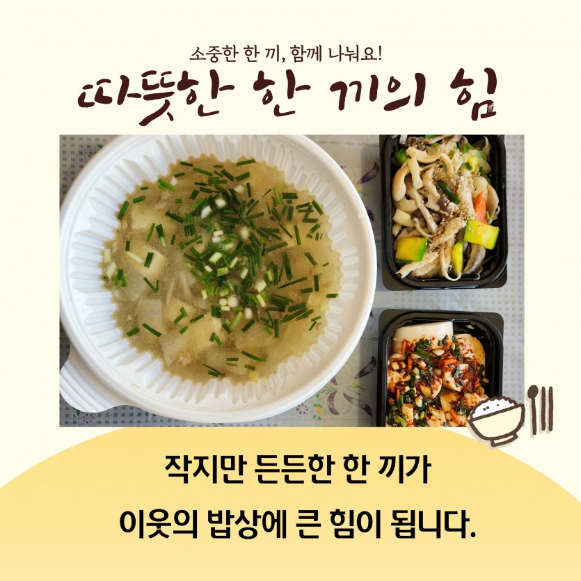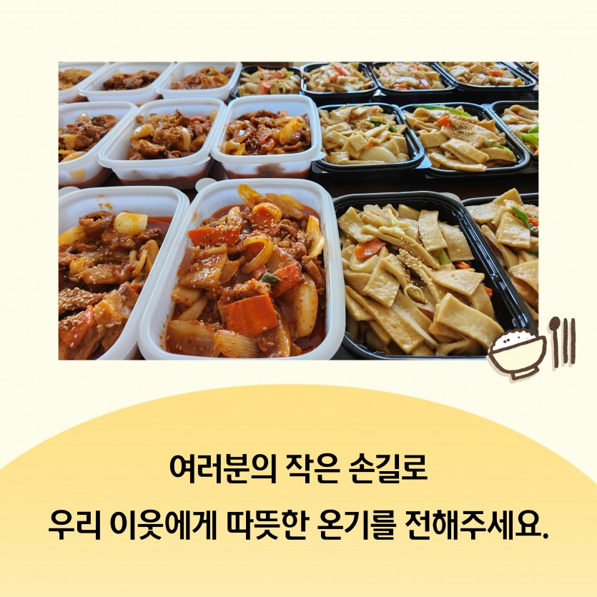 한 끼의 온기가 필요한 이웃이 있습니다. 본문 이렇게 진행됩니다. 펀딩기간 2026-03-30 ~ 2026-06-30 펀딩금액 900,000원 주요 사용 항목 반찬 구매 및 반찬 식재료 구매 0원 0% 펀딩 시작전입니다. 목록