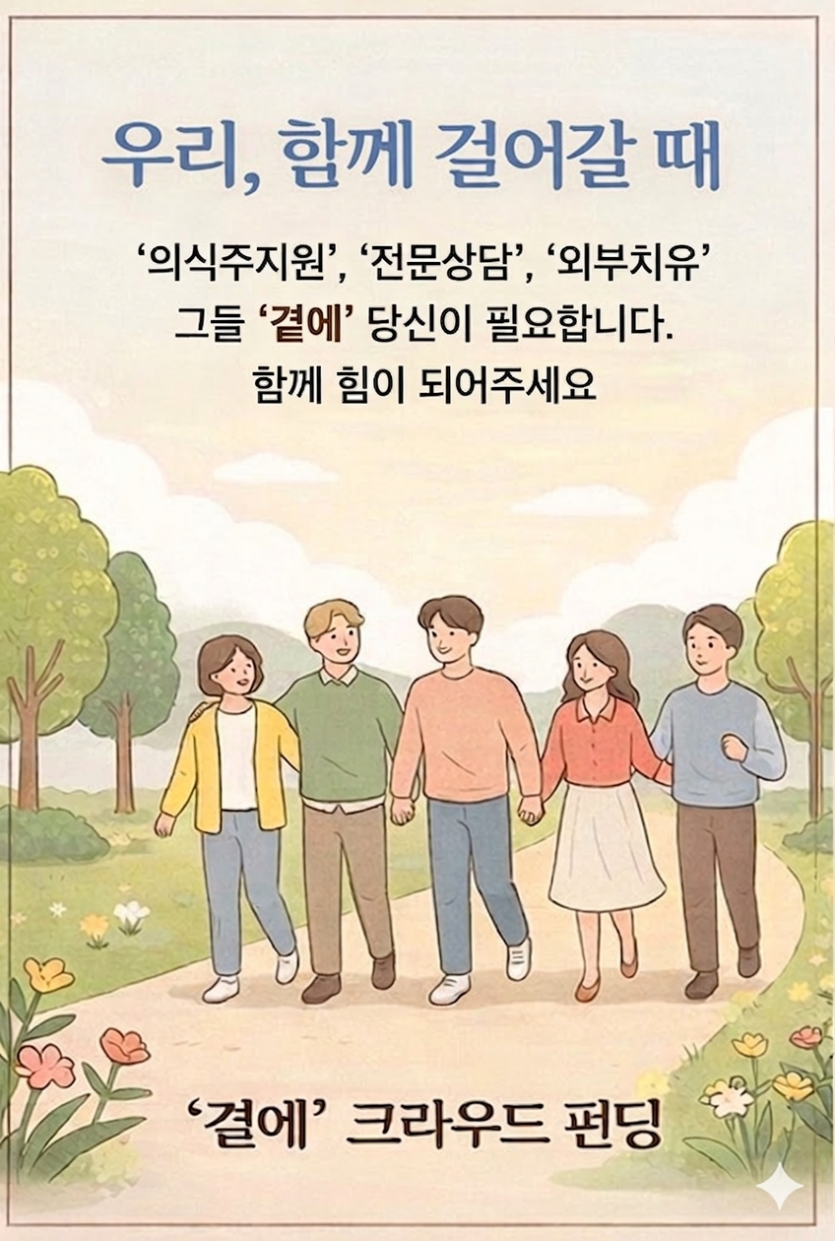 고립은둔대상자를 향한 '곁에' 본문 이렇게 진행됩니다. 펀딩기간 2026-03-30 ~ 2026-06-30 펀딩금액 1,000,000원 주요 사용 항목 의식주 생활지원, 전문가 상담지원, 외부치유활동 등 0원 0% 펀딩 시작전입니다. 목록