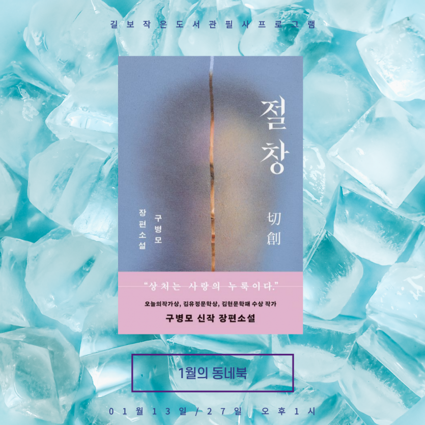 [길보작은도서관] 1월의 동네북 프로그램 안내 페이지 정보 작성자 gilbobooki 댓글 0건 조회 6,297회 작성일 26-01-09 17:41 본문 2026년 첫 해를 여는 1월의 동네북은구병모 작가의 <절창>입니다. 13일과 27일 화요일 오후 1시에 함께모여 필사하고 이야기 나눕니다. 관심있으신 분들의 많은 참여바랍니다. 목록 이전글[교육문화] 2026년 설날 다복다복프로그램 신청 안내 26.02.06 다음글2025년 12월 업무추진비 내역 공개 26.01.09