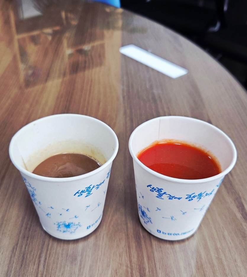 담당 주무관께서 제 앞에 커피와 토마토주스를 내놓습니다.