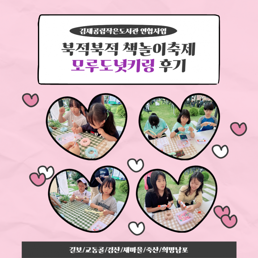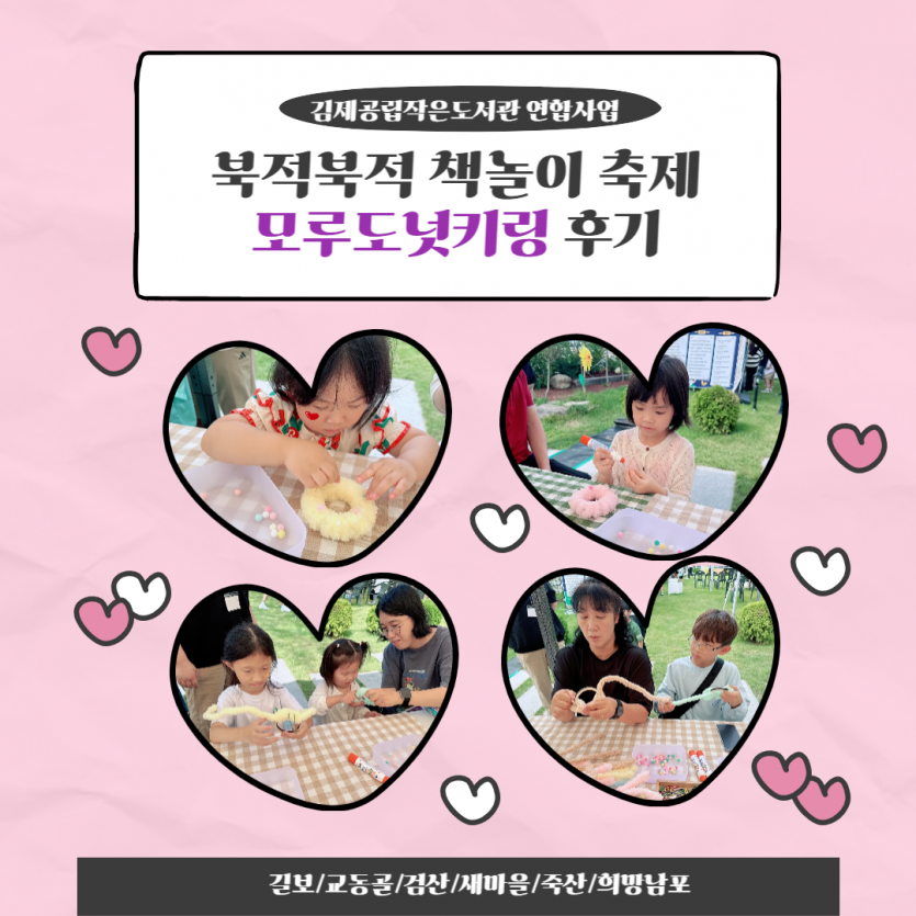 [길보작은도서관] 북적북적책놀이- 모루도넛키링만들기 후기 페이지 정보 작성자 gilbobooki 댓글 0건 조회 4,563회 작성일 25-09-29 17:57 본문 9월 27일 토요일 김제시립도서관에서북적북적 책놀이 축제가 진행되었습니다. 작은도서관 선생님들이 하나로 모여 진행한 프로그램은모루키링만들기!!색색이 귀여운 모루로 키링을 만드는 작업은 쉽고 간단해서어린아이부터 어른까지 누구나 즐겁게 만들 수 있었습니다.알록달록 귀여운 키링 예쁘게 달고 다니세요! ^^ 목록 이전글[지역사회보호] 9월 신풍동 보듬회와 함께하는 반찬나눔지원! 25.09.30 다음글【평생학습 우수프로그램】‘배우며 즐기는 인생학교’ 공예교육 도자기 체험 25.09.29