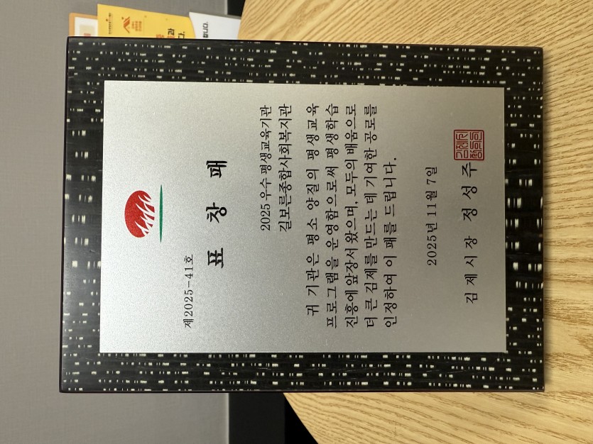 또한 11월 7일, 김제시에서 개최한 ‘평생학습한마당’에서 본 기관이 2025년 우수 평생교육기관으로 표창을 수여하였습니다. 지역사회 곳곳에서 함께해 주신 선한이웃과 협력기관이 있기에 길보른복지관이 더욱 빛날 수 있었습니다.