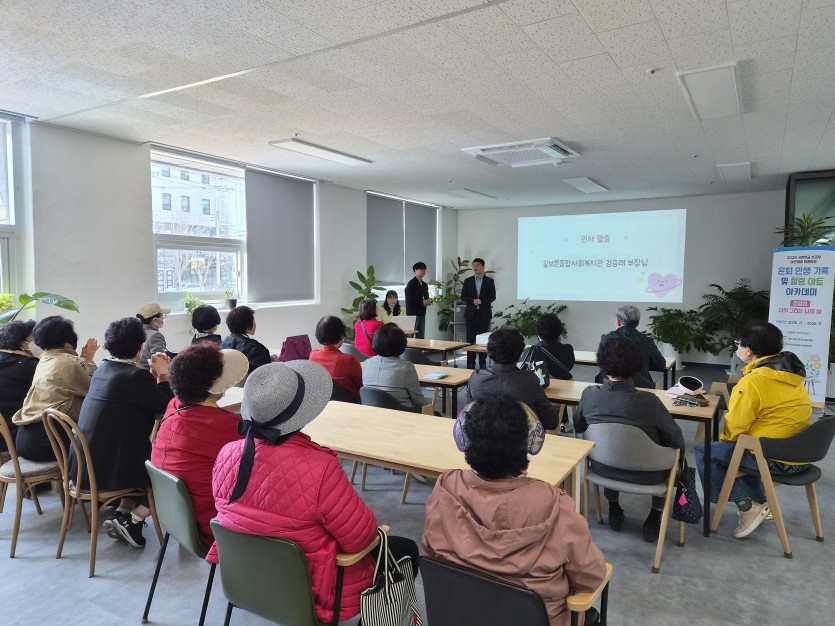 국민연금공단 정읍지사 최연숙 지사장님과 길보른종합사회복지관 김승래 부장님 인사말씀을 필두로 국민연금 수급자 아카데미 사업 소개, 프로그램 구성 및 운영 일정 안내, 참여자 유의사항 및 서류 제출 안내, 향후 교육 및 활동 방향 안내 등을 중심으로 진행되었으며, 참여자분들의 높은 관심 속에 뜻깊은 시간을 가질 수 있었습니다.