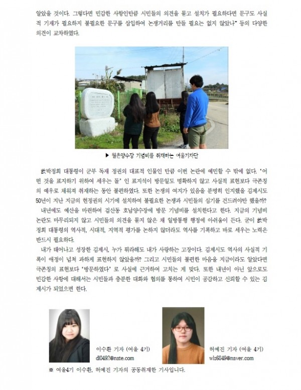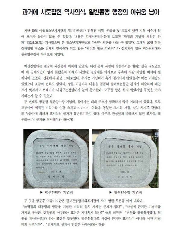 10월 현장취재탐방-전북 김제(박정희 방문기념비) 페이지 정보 작성자 문대광 댓글 0건 조회 13,894회 작성일 16-11-03 09:26 본문 길보른청소년기자단-여울 목록 이전글편의점의 서열 1위, 삼각김밥 / 배은별 기자(여울5기) 17.03.23 다음글5월 현장취재탐방-광주 5.18 민주묘역 16.11.03