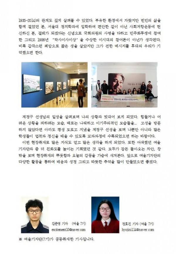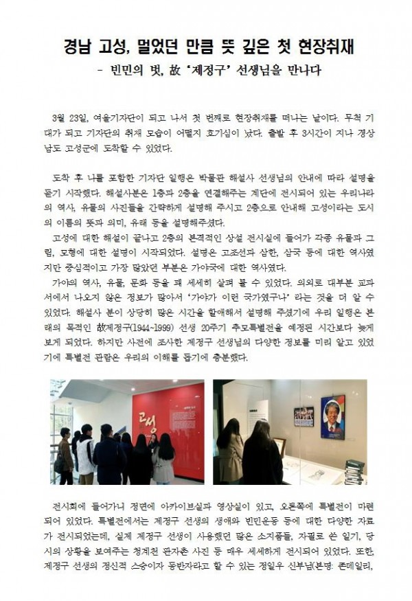 27번째 현장취재, 경남 고성 '제정구' 선생을 만나다 페이지 정보 작성자 문대광 댓글 0건 조회 13,416회 작성일 19-04-02 10:05 본문 27번째 현장취재, 경남 고성 '제정구' 선생을 만나다 목록 이전글세월호 참사 5주기, ‘잊지 않고 기억하고 있나요?’ 19.04.16 다음글길보른청소년기자단‘여울 7기’, 저널리스트를 꿈꾸다 19.03.14