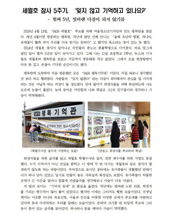 세월호 참사 5주기, ‘잊지 않고 기억하고 있나요?’ 페이지 정보 작성자 문대광 댓글 0건 조회 13,532회 작성일 19-04-16 09:53 본문 세월호 참사 5주기, ‘잊지 않고 기억하고 있나요?’ 벌써 5년, 빛바랜 다짐이 되지 않기를 목록 이전글민주 언론의 사표(社師), 故송건호 선생님 19.06.03 다음글27번째 현장취재, 경남 고성 '제정구' 선생을 만나다 19.04.02
