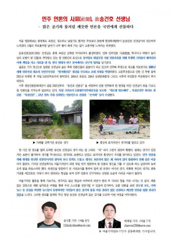 민주 언론의 사표(社師), 故송건호 선생님 페이지 정보 작성자 문대광 댓글 0건 조회 14,489회 작성일 19-06-03 16:39 본문 29번째 현장취재탐방 목록 이전글34번째 현장취재_대하소설 ‘혼불’ 을 품다, 남원 혼불문학관 20.11.09 다음글세월호 참사 5주기, ‘잊지 않고 기억하고 있나요?’ 19.04.16