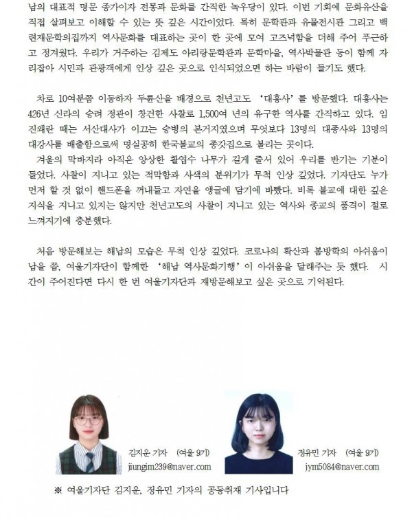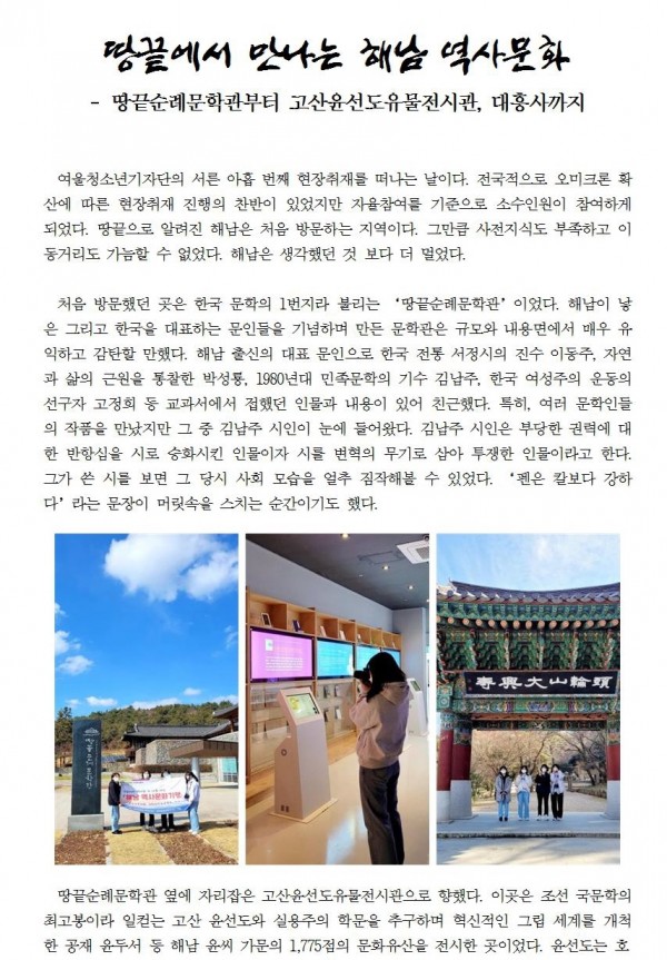 #39번째_ 현장취재탐방_땅끝에서 만나는 해남 역사문화 페이지 정보 작성자 관리자 댓글 0건 조회 13,035회 작성일 22-02-23 15:44 본문 . 목록 이전글#40번째 103주년 원평장터 기미독립만세운동 22.04.14 다음글2월 여울기자단_콘텐츠회의 및 이슈토론 22.02.23