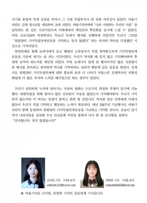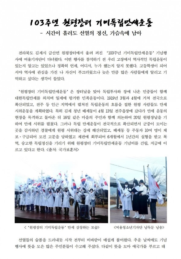#40번째 103주년 원평장터 기미독립만세운동 페이지 정보 작성자 관리자 댓글 0건 조회 12,513회 작성일 22-04-14 00:23 본문 . 목록 이전글#41번째 세월호 8주기, 팽목항의 바람은 여전히 차다 22.04.14 다음글#39번째_ 현장취재탐방_땅끝에서 만나는 해남 역사문화 22.02.23