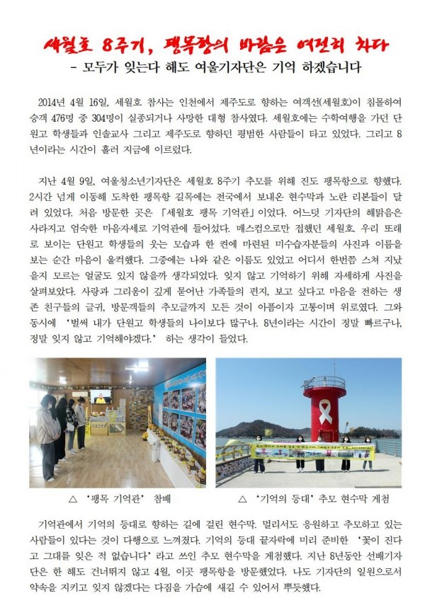 #41번째 세월호 8주기, 팽목항의 바람은 여전히 차다 페이지 정보 작성자 관리자 댓글 0건 조회 12,464회 작성일 22-04-14 00:26 본문 . 목록 이전글#43번째_현장취재탐방기 22.08.16 다음글#40번째 103주년 원평장터 기미독립만세운동 22.04.14