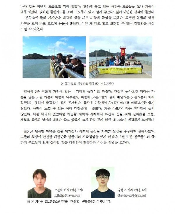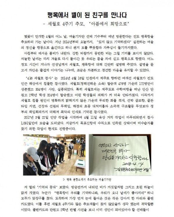 팽목에서 별이 된 친구를 만나다 페이지 정보 작성자 관리자 댓글 0건 조회 9,840회 작성일 18-04-20 17:52 본문 팽목에서 별이 된 친구를 만나다 세월호 4주기 추모, ‘아픔에서 희망으로’ 목록 이전글길보른청소년기자단‘여울 7기’, 저널리스트를 꿈꾸다 19.03.14 다음글인생을 비하하는 청소년, 무엇이 문제인가? 18.02.19
