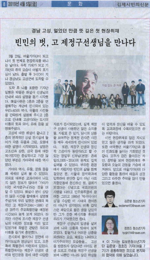빈민의 벗, 제정구 선생 탐방기행 페이지 정보 작성자 문대광 댓글 0건 조회 10,062회 작성일 19-04-10 10:33 본문 김제시민의신문, 보도자료 목록 이전글길보른청소년기자단-여울8기 전문화교육 20.10.12 다음글27번째 현장취재탐방-3 19.03.28