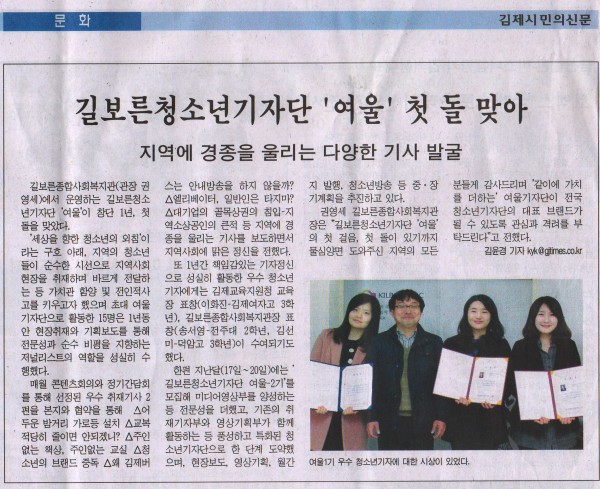 매월 콘텐츠회의와 정기간담회를 통해 선정된 우수 취재기사 2편을 김제시민의신문과 협약을 통해 ‘어두운 밤거리 가로등 설치’, ‘교복 적당히 줄이면 안되겠니?’, ‘주인없는 책상, 주인없는 교실’, ‘청소년의 브랜드 중독’, ‘왜 김제버스는 안내방송을 하지 않을까?’, ‘엘리베이터, 일반인은 타지마?’, ‘ 대기업의 골목상권의 침입-지역소상공인의 큰적’ 등 지역에 경종을 울리는 기사를 보도하여 지역사회에 맑은 정신을 전하였다.