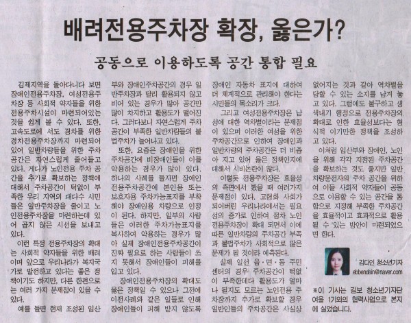 배려전용주차장 확장, 옳은가? 페이지 정보 작성자 문대광 댓글 0건 조회 9,898회 작성일 14-03-18 10:32 본문 김제여자고등학교 김다인 기자의 취재기사입니다. 목록 이전글불 꺼진 간판, 버려진 제2의 집 14.03.18 다음글길보른청소년기자단 창단 1년을 맞이하다 14.03.18
