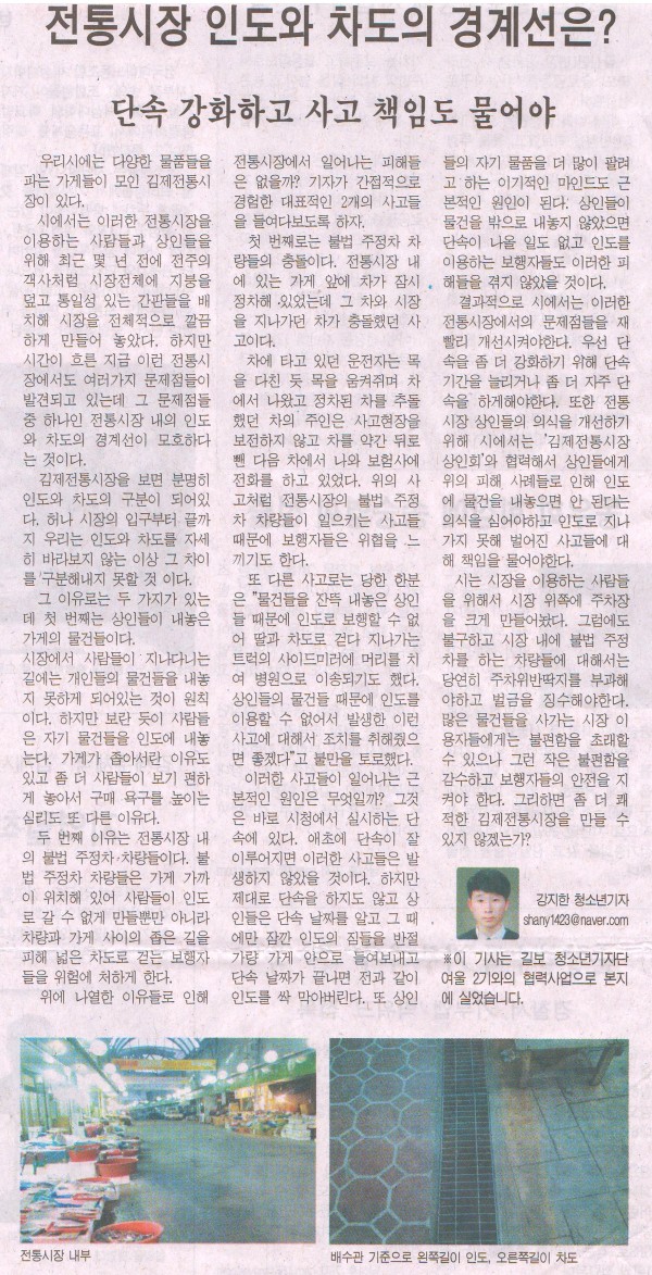 전통시장 내의 인도와 차도의 경계선은 어디로 - 강지한 기자 페이지 정보 작성자 관리자 댓글 0건 조회 10,345회 작성일 14-05-09 18:24 본문 전통시장 내의 인도와 차도의 경계선은 어디로 -강지한 기자 목록 이전글김제 소방서 벽화그리기,“훨씬 보기에도 좋아! (최사랑 기자) 14.05.28 다음글지나가기 무서워요 (최기오 기자) 14.04.11