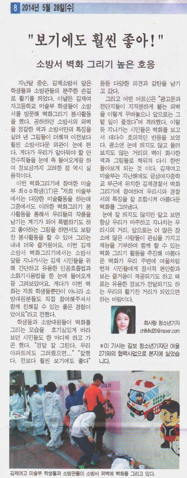 4월 14일. 김제소방서 앞은 학생들과 소방관들의 분주한 손길로 활기를 띄었다. 이 날은 김제여자고등학교 미술부 학생들이 소방서를 방문하여 벽화 그리기 봉사활동을 하였다. 공허하던 소방서의 외벽을 정갈한 색과 소방서만의 특징을 살려 낸 그림들이 더해져 이전보다 훨씬 소방서다운 외관이 눈에 띈다. 게다가 우리가 알아둬야 할 안전수칙들을 눈에 쏙 들어오게끔 하여 정보성까지 고려한 점 역시 실용적이다.