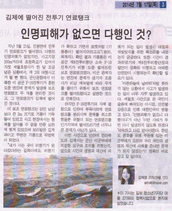 김제시에 떨어진 전투기 연료탱그 - 김채영 기자 페이지 정보 작성자 문대광 댓글 0건 조회 9,994회 작성일 14-07-18 14:36 본문 김제시에 떨어진 전투기 연료탱그 - 김채영 기자 목록 이전글수업에 쓰지도 않는 교과서, 비싼 값 주고 왜 사나? 14.08.19 다음글김제 소방서 벽화그리기,“훨씬 보기에도 좋아! (최사랑 기자) 14.05.28
