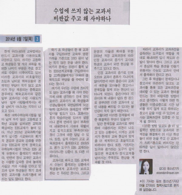 학기 초 학생들이 한 해 교과서를 구입하려면 교육부 명령 가격을 기준으로 10만 원이 넘는 적지 않은 돈을 내야 한다. 여기서 문제는 20권이 훌쩍 넘는 EBS연계교재를 구입하여야 할 고3학생들에게는 더욱더 경제적으로 부담을 줄 수밖에 없다는 것이다.