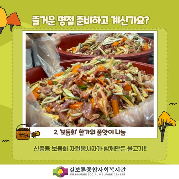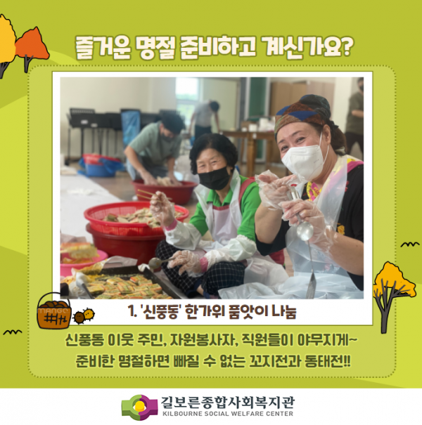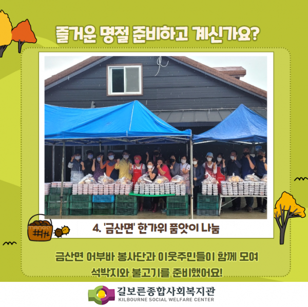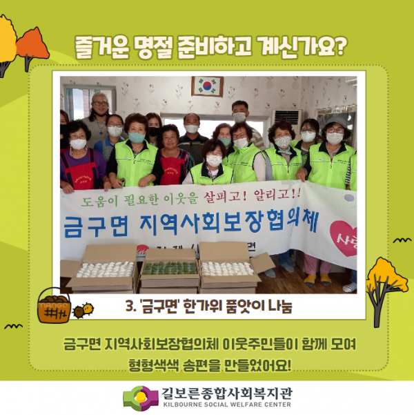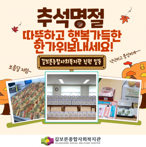 2021. [추석명절] 풍족한 한가위보내세요! 페이지 정보 작성자 관리자 댓글 0건 조회 20,859회 작성일 21-09-17 17:00 본문 #길보른종합사회복지관#김제시 #신풍동 #금산면 #금구면 #보듬회 #어부바 #금구면지역사회보장협의체#한가위품앗이나눔지역주민, 후원자, 자원봉사자, 주민들이 있어 참 행복한 한가위입니다!추석 명절 따뜻하고 행복 가득 한 한가위 보내시길 바랍니다! 목록 이전글2021. 금구면 과일도시락, 주민들의 따뜻한 손길~ 22.02.16 다음글2021. 마을협동화사업 취미여가 건강프로그램 따끈따끈한 후기 21.09.07