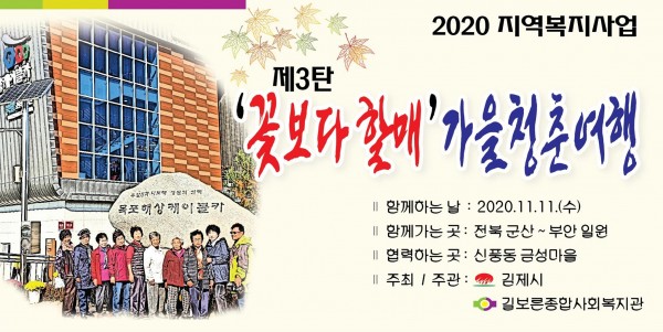 2020. 꽃보다 할매, 군산, 부안 일원으로 떠났던 가을청춘여행 페이지 정보 작성자 관리자 댓글 0건 조회 16,070회 작성일 20-11-27 13:52 본문 제1탄 꽃보다할매는 태안으로 나들이로 다녀왔었고,제2탄 꽃보다할매는결연마을 어르신들과 함께 목포나들이를 다녀왔습니다.11월에는, 제3탄 군산~부안 가을청춘여행 이야기를 들려드리려고합니다.청춘들의 궁금한 이야기!!사진으로 함께 해주세요 >_<!! 목록 이전글2020. 미리크리스마수~ 마을김장축제한다는디!? 20.11.27 다음글2020. 마을리더워크숍을 다녀왔습니다! 20.11.27