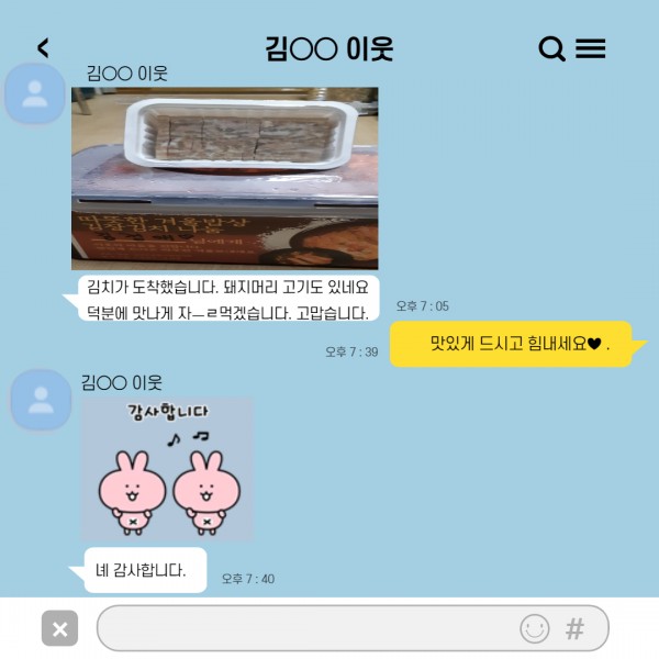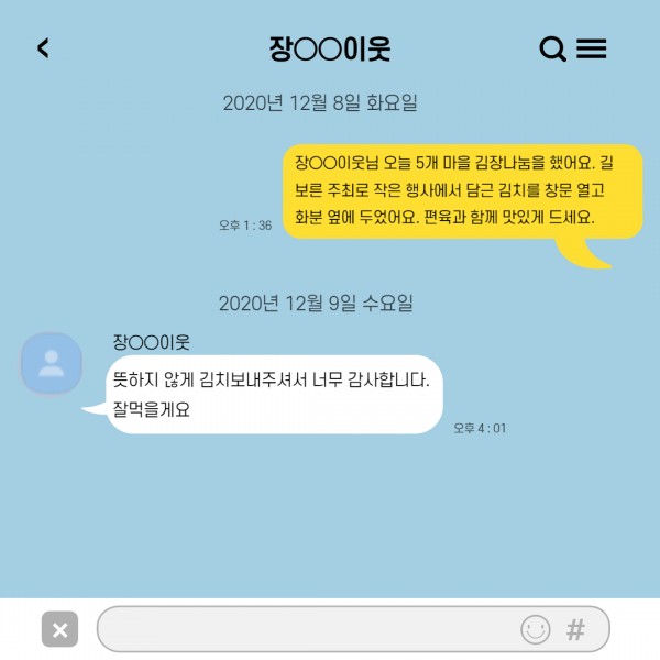 2020. 금산면 김장김치 나눔 후기가 왔어요!! 페이지 정보 작성자 관리자 댓글 0건 조회 16,190회 작성일 20-12-11 09:35 본문 카톡왔숑~! 카톡왔습니다. 지난 10월 8일 금산 김장김치 나눔에 댁에 계시지 않아 직접 전달이 어려웠던 주민분들은 현관 입구에 놓고 안내 문자 보내드렸습니다. 그 날 오후 김치를 받으신 이웃분께서 감사하다는 카톡을 보내주셨습니다. 오늘도 마음 따뜻한 금산 수류권역이였습니다.#마을협동화사업#마을공동밥상김장김치나눔#이웃의정 목록 이전글2020. 2020년 피날레~ , 「동남권역-민관복지워킹사업 Ⅴ」 동지팥죽나눔 20.12.22 다음글2020. 금산 꽃미녀 마을공동밥상 김장김치 나눔 활동 :-D 20.12.09