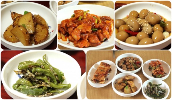 메추리알장조림, 제육볶음, 꽈리고추조림, 두부조림, 겉절이, 감자조림과