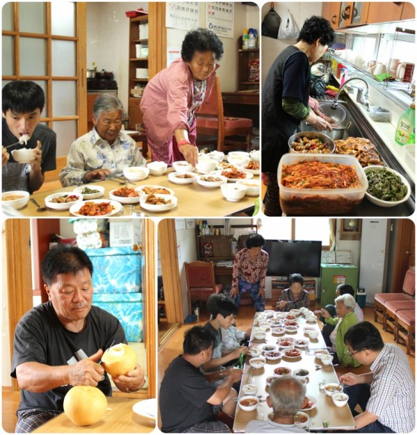 아침부터 어르신들이 경로당에 한데 모이셔서 오순도순 '밑반찬'과 '행복밥상'을
