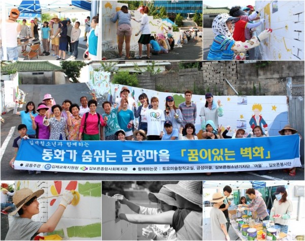 지역의 작가님, 대학생, 김제교육지원청-토요미술동아리, 금성마을 주민, 길보른자원봉사단, 청소년기자단-여울, 기관 선생님들이 단합하여 동화마을을 이루었습니다.