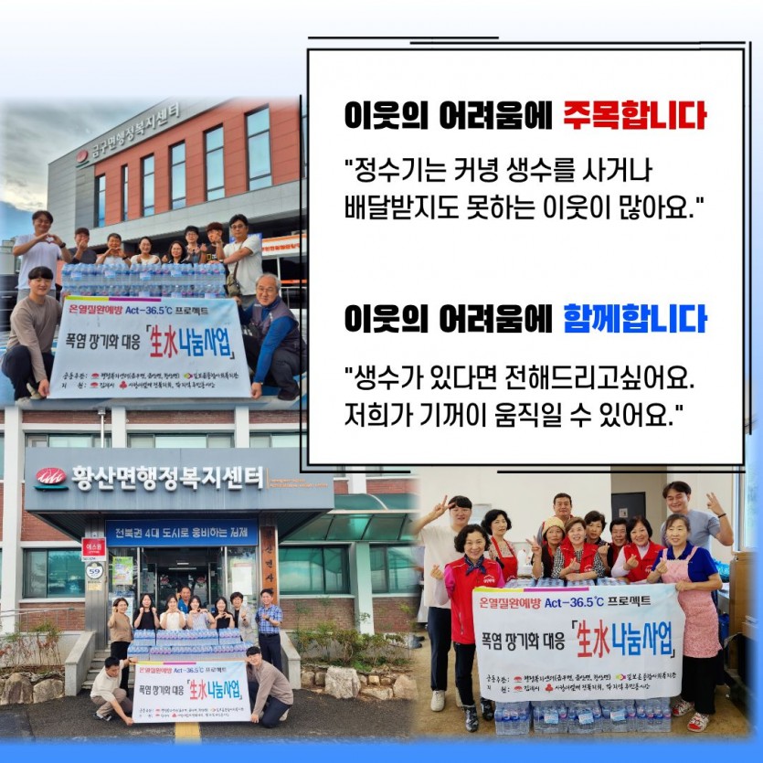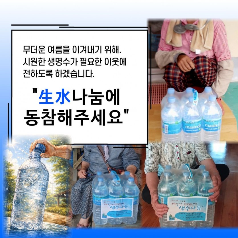 폭염장기화, 生水가 절실히 필요합니다. 본문 이렇게 진행됩니다. 펀딩기간 2026-03-30 ~ 2026-06-30 펀딩금액 1,200,000원 주요 사용 항목 온열질환 취약계층 대상 300세대 전달 0원 0% 펀딩 시작전입니다. 목록