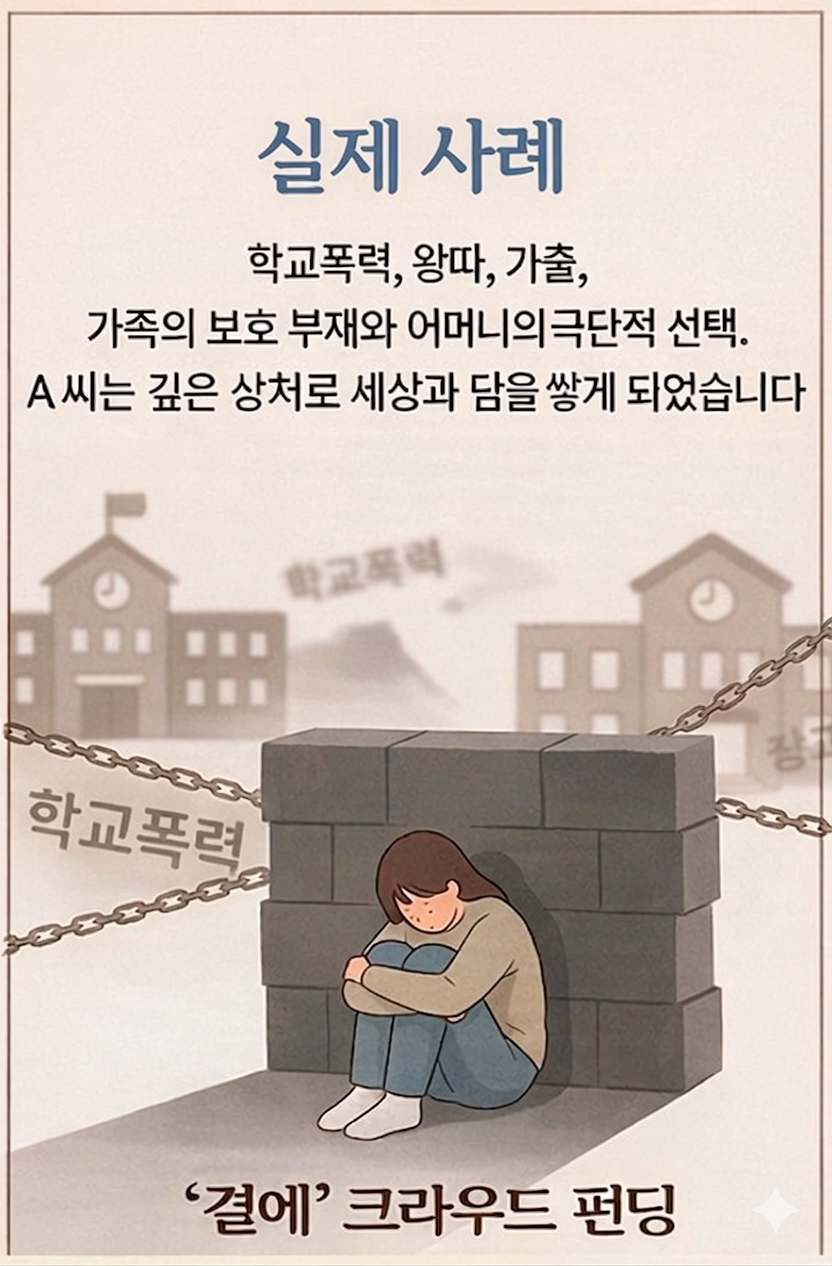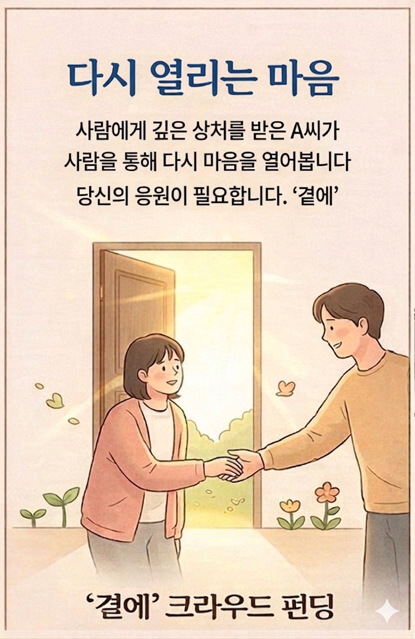 고립은둔대상자를 향한 '곁에' 본문 이렇게 진행됩니다. 펀딩기간 2026-03-30 ~ 2026-06-30 펀딩금액 1,000,000원 주요 사용 항목 의식주 생활지원, 전문가 상담지원, 외부치유활동 등 0원 0% 펀딩 시작전입니다. 목록