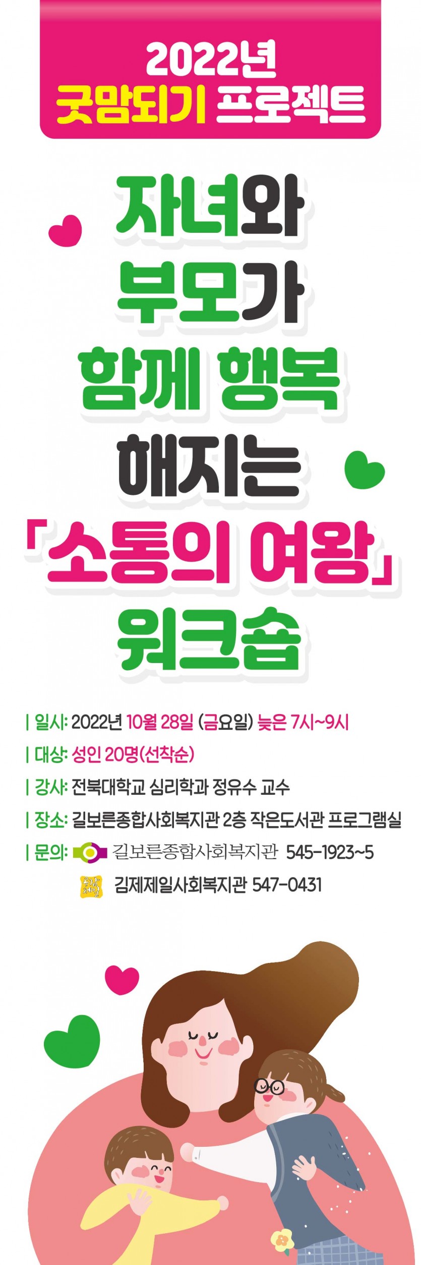 2022년 10월 굿맘되기 프로젝트 (자녀와 부모가 함께 행복해지는 소통의 여왕 워크숍) 참여자 모집 페이지 정보 작성자 황은진 댓글 0건 조회 32,825회 작성일 22-10-17 17:19 본문 2022년 굿맘되기 프로젝트자녀와 부모가 함께 행복해지는「소통의 여왕 」워크숍일시: 2022년 10월 28일 (금요일) 늦은 7시~9시 대상: 성인 20명(선착순)강사: 전북대학교 심리학과 정유수 교수 장소: 길보른종합사회복지관 2층 작은도서관 프로그램실문의: 길보른종합사회복지관 063-545-1923~5, 김제제일사회복지관 063-547-0431 * 선착순 마감시까지 전화접수 가능합니다. ^_^ 목록 이전글겨울철 김장 프로그램 자원봉사 인원 모집 안내 22.11.03 다음글2022년 10월 수의계약 내역 공개 22.10.05