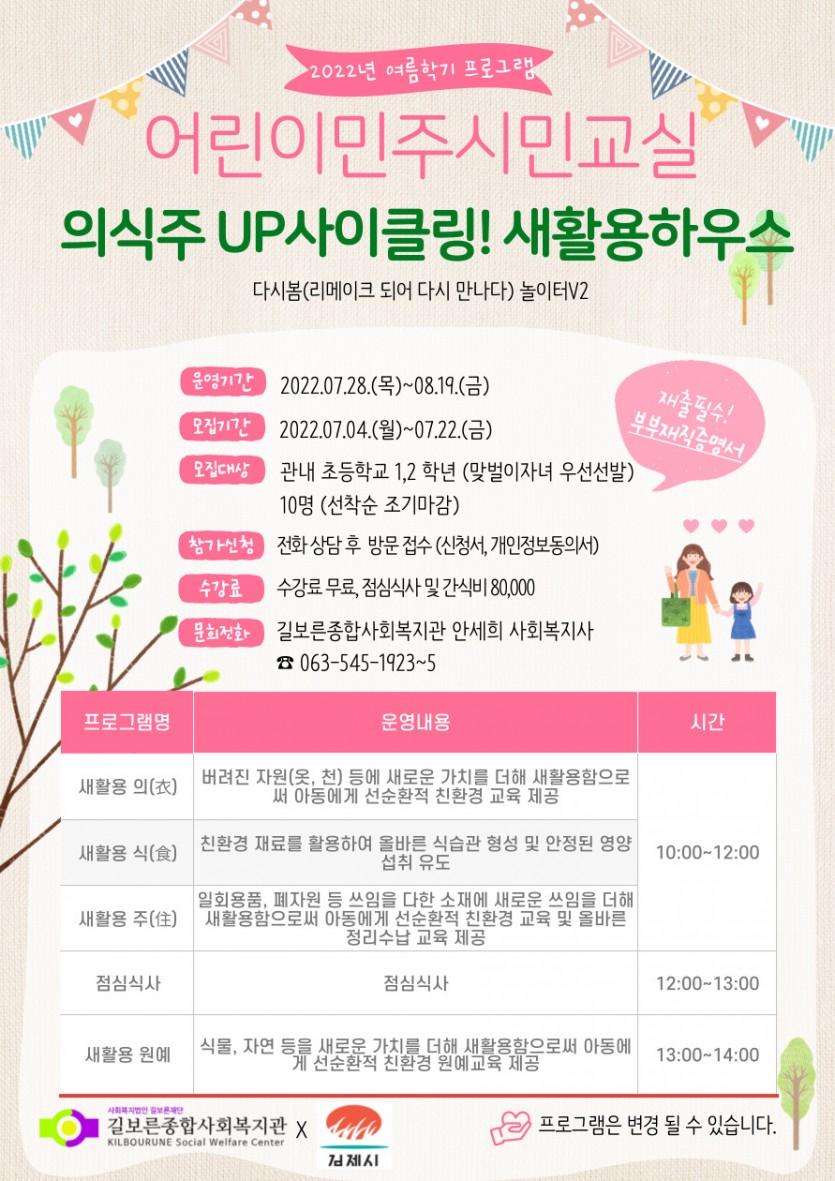 2022년 여름학기 프로그램 어린이민주시민교실 참여자 모집! 페이지 정보 작성자 안세희 댓글 0건 조회 32,778회 작성일 22-07-04 10:11 본문 목록 이전글2021년 기부식품제공사업(푸드뱅크, 푸드마켓) 모집 및 제공내역 22.07.06 다음글길보른행복학습센터 실버요가&라인댄스 개소, 참여자 모집!! 22.06.08