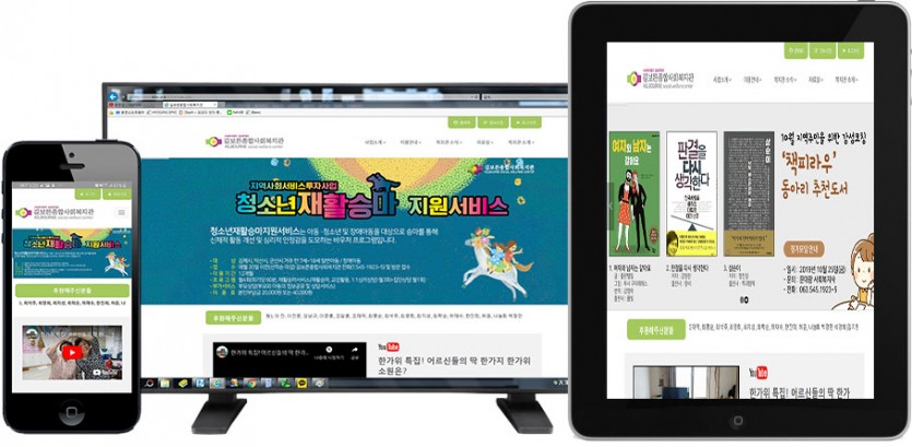 - 모바일로 복지관 홈페이지에 접속하는 많은 분들의 불편함을 최소화 하기 위한 편리한 반응형 웹사이트를 구축하였습니다.