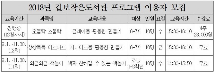 - 길보작은도서관에서 2018년 하반기 프로그램 이용자를 모집합니다.