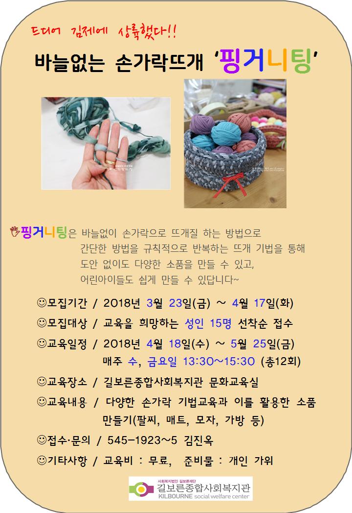 김제상륙!! 손가락 뜨개 '핑거니팅' 이용자 접수 받아요~ 페이지 정보 작성자 김진옥 댓글 0건 조회 31,467회 작성일 18-04-10 14:14 본문 바늘없이 손가락으로 뜨개하는 핑거니팅~한번 도전해부세요~~^^ 목록 이전글어머! 이건 꼭 있어야해! 재난안전지도사 교육생 모집 18.04.10 다음글2018년 제1회 길보른종합사회복지관 시설회계 세입세출 추가경정예산 공고 18.03.21