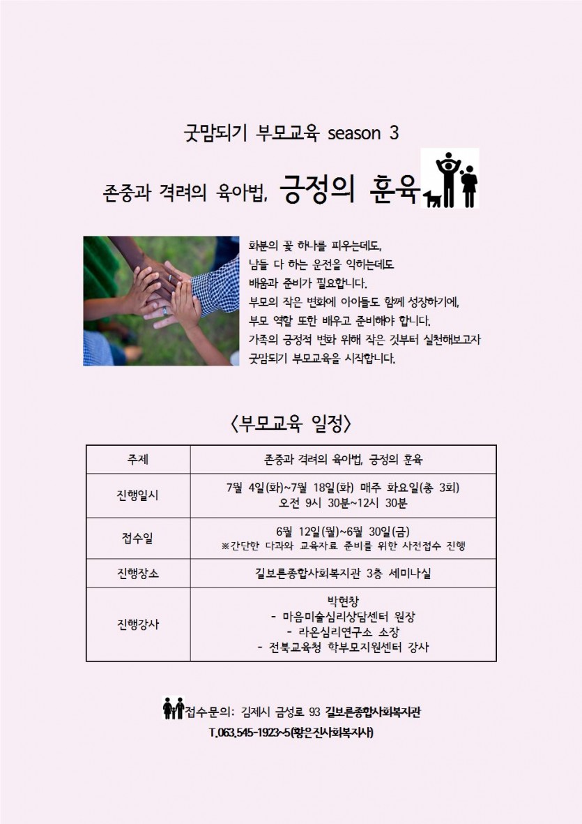 (부모교육 참여자 모집) 7월에 함께 듣고 싶은 교육이 있습니다. 페이지 정보 작성자 황은진 댓글 0건 조회 29,684회 작성일 17-06-09 14:59 본문 늘 공감과 웃음을 주시는 박현창 선생님의 강의입니다. 힐링과 힘을 얻는 시간이 되시길 바라며, 많은 관심 부탁드립니다. 목록 이전글음악줄넘기 자격증과정 수강생을 모집합니다~ 17.06.22 다음글리본핀과 와이어 머리띠 무료체험 선착순 모집합니다. 17.05.31