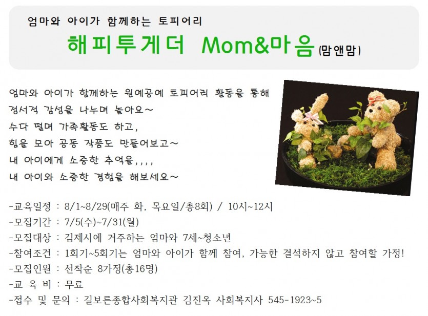 (해피투게더 맘앤맘) 엄마와 아이가 함께하는 원예공예 토피어리 참여자 모집해요~ 페이지 정보 작성자 김진옥 댓글 0건 조회 29,741회 작성일 17-07-06 17:35 본문 *상기 일정은 기관 사정상 변경될 수 있으니 양해부탁드립니다. 목록 이전글(베이비 소잉 스쿨) 재봉틀 교육 참여자 모집해요~ 17.07.06 다음글자봉 교육 안내 (방학) 17.06.30