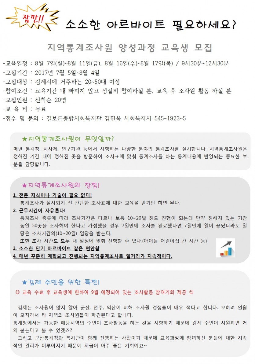 (지역통계조사원 양성과정) 소소한 아르바이트 기회!! 교육생 모집합니다. 페이지 정보 작성자 김진옥 댓글 0건 조회 29,959회 작성일 17-07-06 17:41 본문 * 기관 사정에 따라 일정이 변경될 수 있으니 양해부탁드립니다. 목록 이전글(베이비소잉스콜) 재봉틀교육 일정이 변경되었어요~ 17.07.12 다음글(창의요리지도사 자격증과정) 참여자 모집해요~ 17.07.06