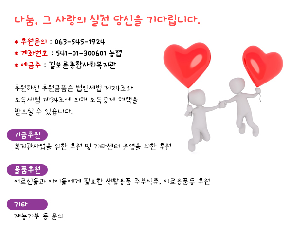 나눔, 사랑의 실천을 기다립니다. 페이지 정보 작성자 관리자 댓글 0건 조회 29,115회 작성일 17-01-02 14:25 본문 . * 후원금품 연초 집중 모집합니다.* 많은 따뜻한 관심과 사랑 부탁드립니다.* 문의사항 : 지역조직과 김다래 사회복지사 (063-545-1924) 목록 이전글2017년 기부식품제공사업(푸드뱅크․푸드마켓) 이용신청안내 17.01.03 다음글2017년 길보른종합사회복지관 시설회계 세입세출 예산 공고 16.12.22