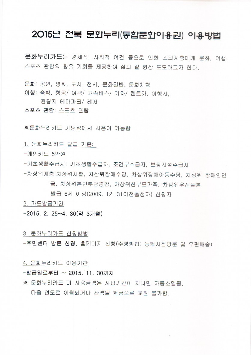 전북 문화누리(통합문화이용권) 이용 안내 페이지 정보 작성자 관리자 댓글 0건 조회 26,566회 작성일 15-04-22 17:00 본문 . 목록 이전글직원채용-서류전형 합격자 및 면접시험 시행 공고 15.04.23 다음글세계 책의 날 '책 Dream' 행사 안내 15.04.20