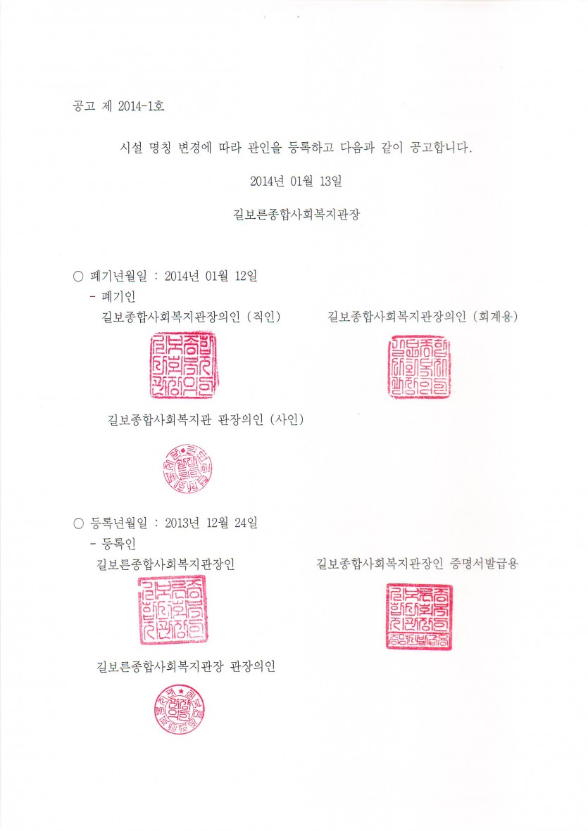 길보른종합사회복지관 관인 등록 공고 페이지 정보 작성자 관리자 댓글 0건 조회 28,854회 작성일 14-01-13 18:49 본문 길보른종합사회복지관 공고 제2014-1호시설 명칭 변경에 따라 관인을 등록하고 다음과 같이 공고합니다. 목록 이전글설날 떡국마을잔치에 참여할 자원봉사자를 모집합니다. 14.01.23 다음글2015학년도 길보른어린이집 보육교사 모집 14.01.13