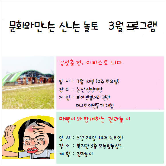 「놀토」3월 프로그램 안내 페이지 정보 작성자 임옥순 댓글 0건 조회 29,205회 작성일 12-02-27 16:16 본문 . 수정 삭제 목록 이전글삼성꿈장학재단 지원 "별빛달빛 어린이 오케스트라" 아동, 청소년 모집 12.03.05 다음글길보종합사회복지관 사회복지사 채용 공고 12.02.27