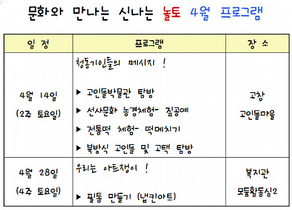 「문화와 만나는 신나는 놀토」4월 프로그램 안내 페이지 정보 작성자 임옥순 댓글 0건 조회 29,607회 작성일 12-03-29 16:46 본문 ※ 접수 문의 : 길보종합사회복지관 임옥순 T. 545-1923~5 수정 삭제 목록 이전글「로봇과학교실」이용자 모집 12.04.19 다음글사회복지사 임용시험 최종합격자 명단 공고 12.03.19