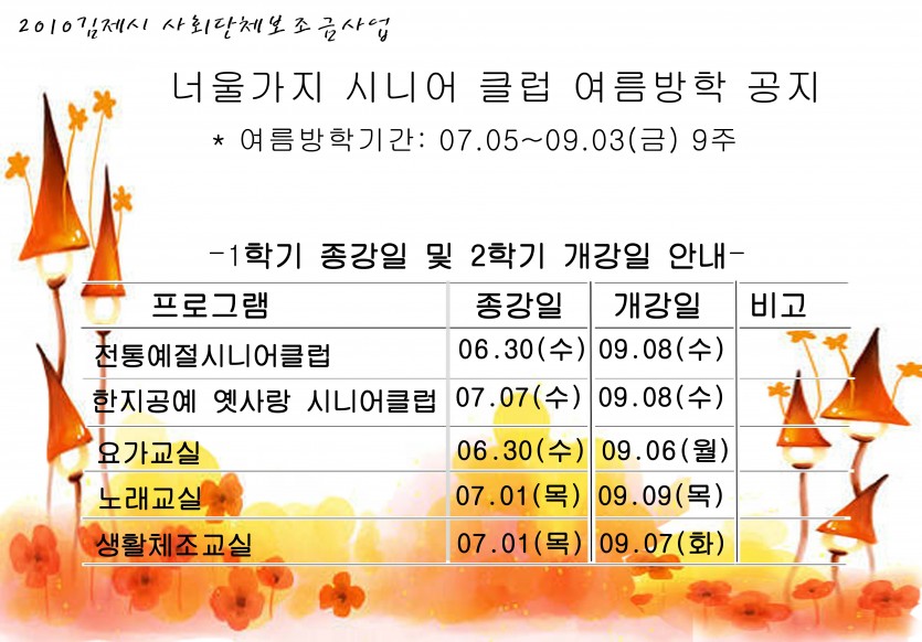 너울가지 시니어클럽 여름방학 공지 페이지 정보 작성자 관리자 댓글 0건 조회 32,274회 작성일 10-06-24 15:21 본문 문의 조미애 사회복지사 545-1923~4 목록 이전글2010년 하계 아동 학습멘토 자원봉사자 모집 10.06.25 다음글2010 하계 사회복지현장실습 안내 10.05.24