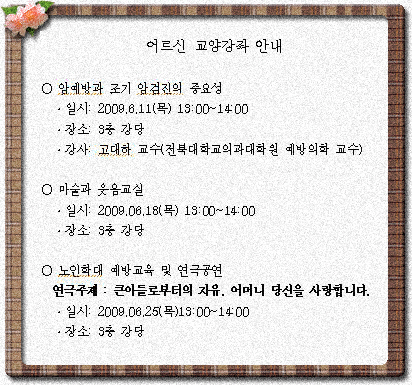 어르신 교양강좌 안내 페이지 정보 작성자 조미애 댓글 0건 조회 31,528회 작성일 09-06-02 16:10 본문 많은 참석바랍니다. 목록 이전글사회복지사 채용 서류전형 합격자 및 면접시험 시행계획 공고 09.06.03 다음글푸드마켓 전담인력 채용 서류전형 합격자 및 면접시험 시행계획 공고 09.05.28