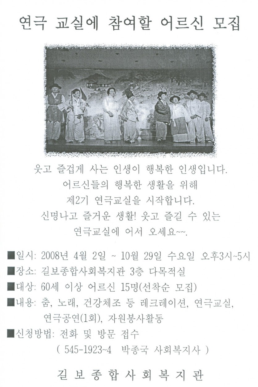 어르신연극교실 참여자 모집 페이지 정보 작성자 박종국 댓글 0건 조회 31,882회 작성일 08-04-02 08:50 본문 신청하세요... 목록 이전글길보작은도서관 시범운영 08.04.07 다음글2008년 제1차 운영위원회를 진행합니다. 08.03.27