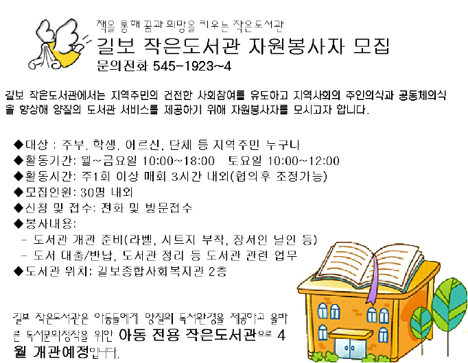 작은도서관 운영에 함께할 자원봉사자를 모집합니다. 페이지 정보 작성자 박종국 댓글 0건 조회 32,972회 작성일 08-01-24 10:59 본문 문의/접수: 545-1923~4 담당: 사회복지사 박종국 목록 이전글수지침시술 프로그램 시간 변경 안내 08.06.11 다음글야간요보호아동통합지원사업 조이하우스 아동보호교사 채용 공고 08.05.29