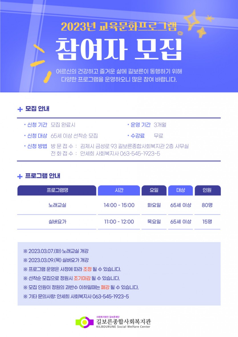 2023년 교육문화프로그램 참여자 모집 페이지 정보 작성자 관리자 댓글 0건 조회 31,013회 작성일 23-02-09 14:02 본문 목록 이전글2023년 지역주도형 청년일자리사업 참여자 채용시험 서류전형 합격자 및 면접시험 시행 공고 23.02.23 다음글2023년 길보른종합사회복지관 지역주도형 청년일자리사업 직원 채용 공고 23.02.08