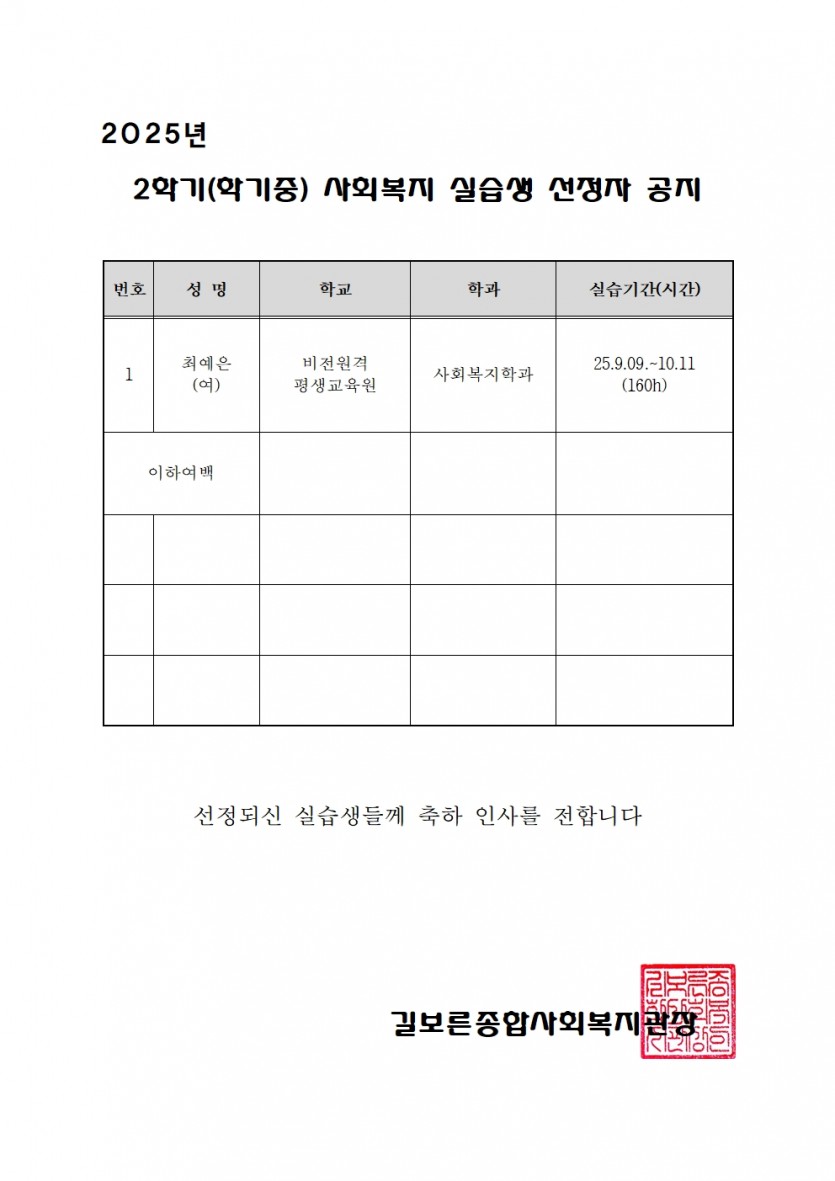 【사회복지실습생 선정 안내】2025년 2학기(학기중) 사회복지실습생 선정 안내 페이지 정보 작성자 관리자 댓글 0건 조회 1,735회 작성일 25-09-16 09:30 본문 2025년 2학기(학기중) 사회복지실습생 선정되었음을 공지합니다. 목록 이전글[교육문화] 2025년 가을학기 교육문화프로그램 참여자 모집 25.09.17 다음글【사회복지실습생 모집 안내】2025년 2학기 사회복지실습생 모집 / 안내 25.08.27